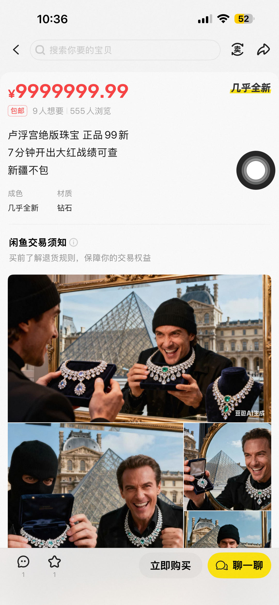 震惊全球的卢浮宫劫案发生后,国内某二手交易平台上出现“卢浮宫正品”珠宝,标价从99万到9999万元不等,文案戏称“卢浮宫正品”“9.5新,现货在手、刚取货”“保存完好”。