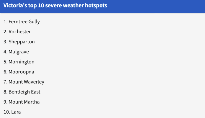 而Ferntree Gully、Mulgrave和Mount Waverley则主要因暴风天气导致高额损失,