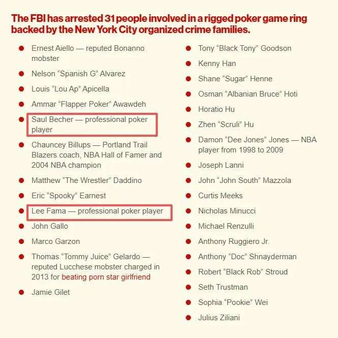 FBI公布了“老千案”中逮捕的31人,可以看到除了黑手党成员、NBA球员外,还有两名职业扑克玩家,人家靠这手艺吃饭的,想赢普通人不要太简单......