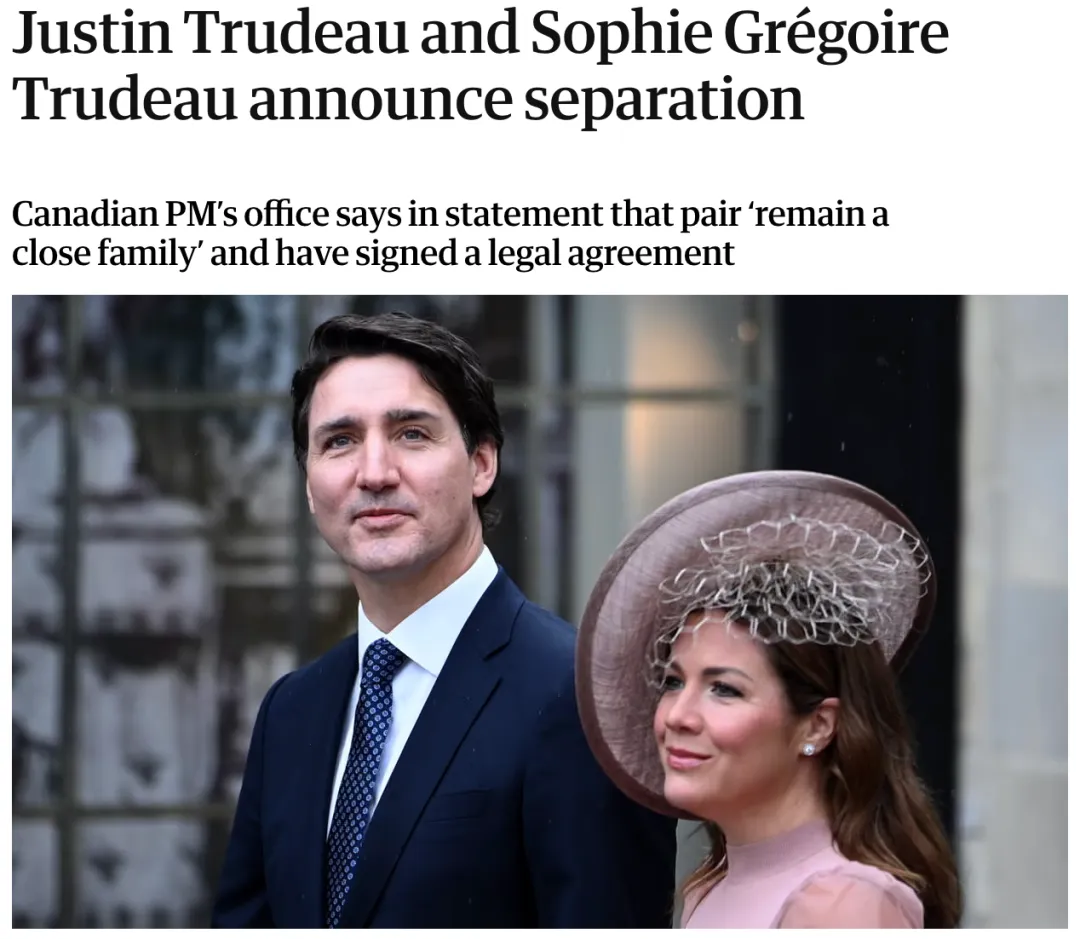 特鲁多在2023年宣布与结婚18年的妻子苏菲·格雷瓜尔·特鲁多(Sophie Grégoire Trudeau)分居。
