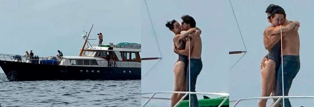 两人在加州圣巴巴拉(Santa Barbara)外海的豪华游艇Caravelle号上相拥。