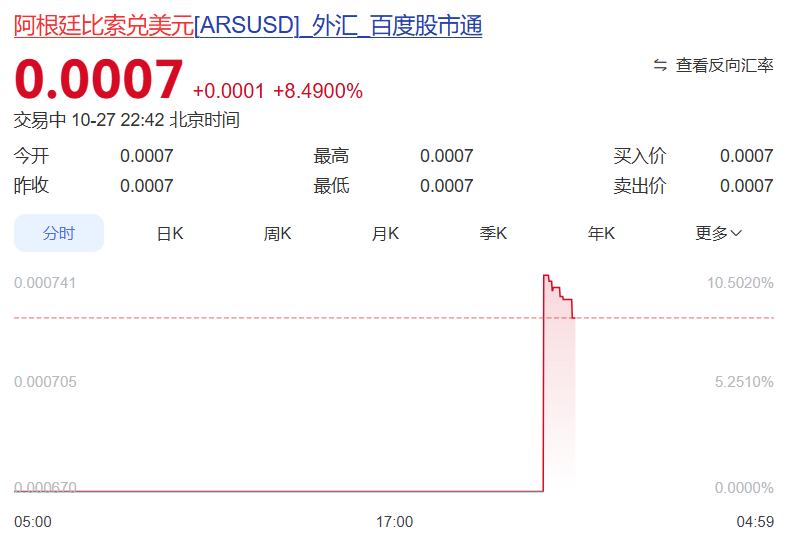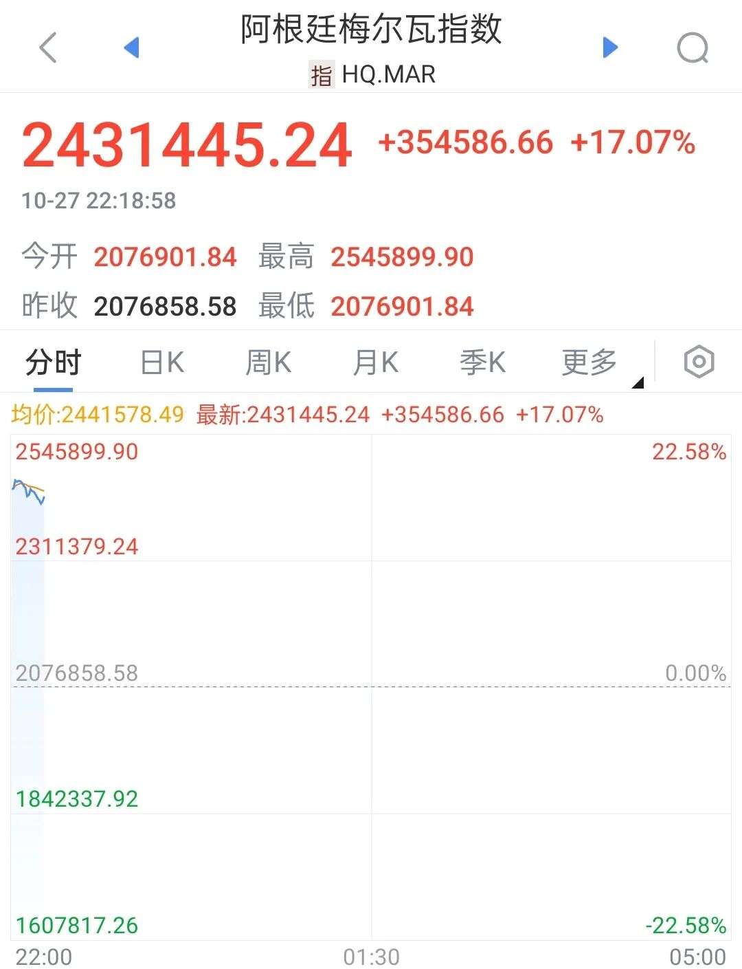 当地时间10月27日,阿根廷主要股指一度涨超20%,阿根廷比索兑美元一度涨超10%。