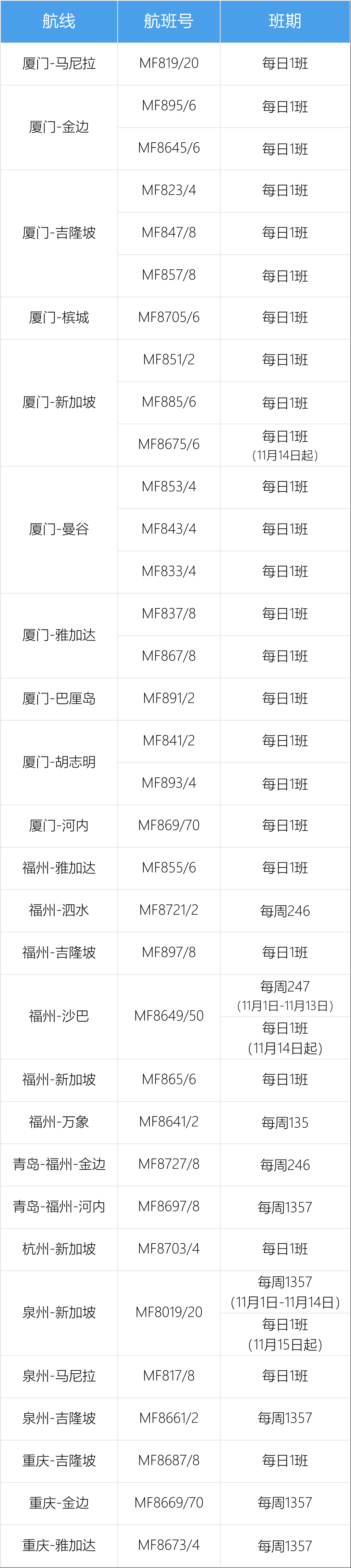 注:1.2025年9月9日起,厦门航空实际承运中国至柬埔寨金边的航班已转场至金边德崇国际机场运行。