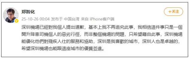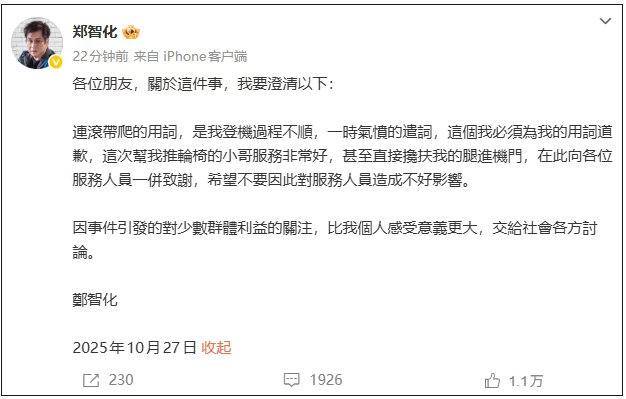 郑智化表示,当时情绪激动、用词不当,“对事件描述引起的误会深感抱歉”,并感谢公众对残障旅客出行权益的关注。