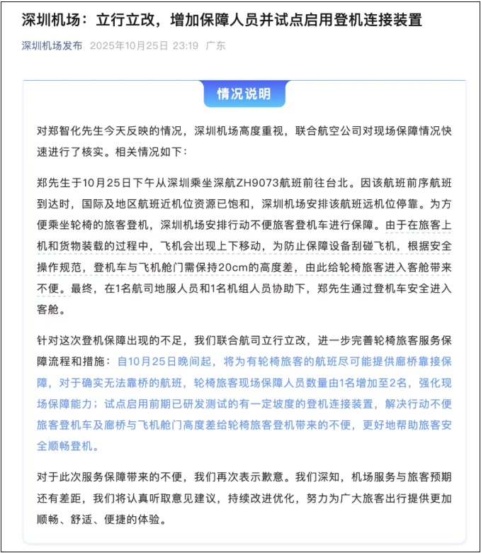 10月26日,郑智化发文回应,表示已收到机场方面的致歉,“不再追究此事”,希望借此推动无障碍服务改进。