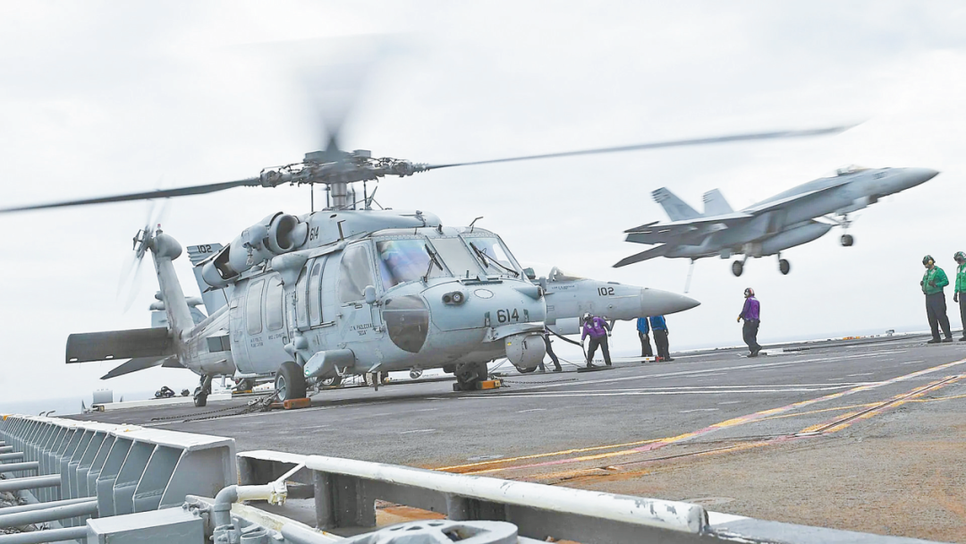 美国航母上搭载的“海鹰”直升机和“超级大黄蜂”战斗机