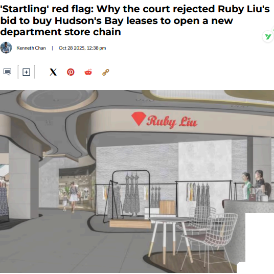 10月25日,安省高等法院正式驳回BC省华裔企业家刘伟宏(Ruby Liu)试图接手Hudson’s Bay(HBC)全国25份商场租约的提案——也就是说,房东们不必接受她作为新租户。