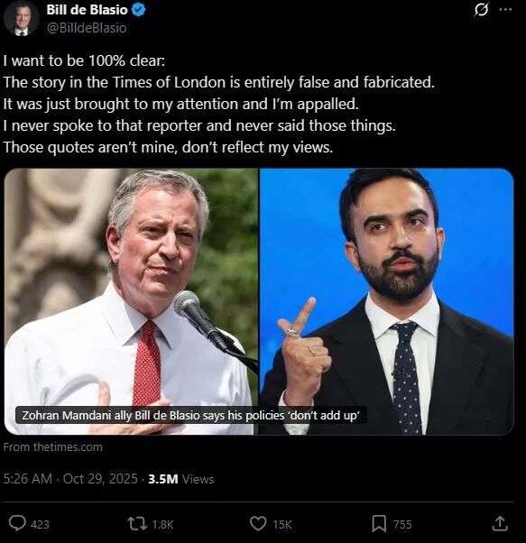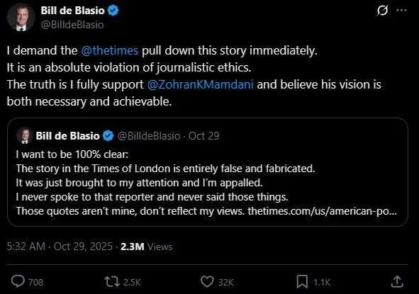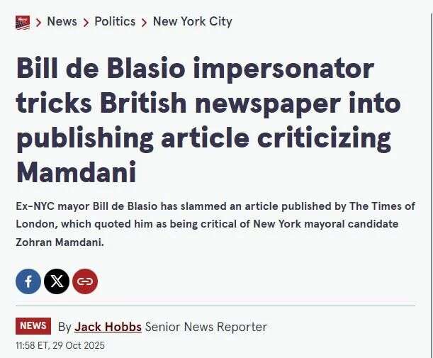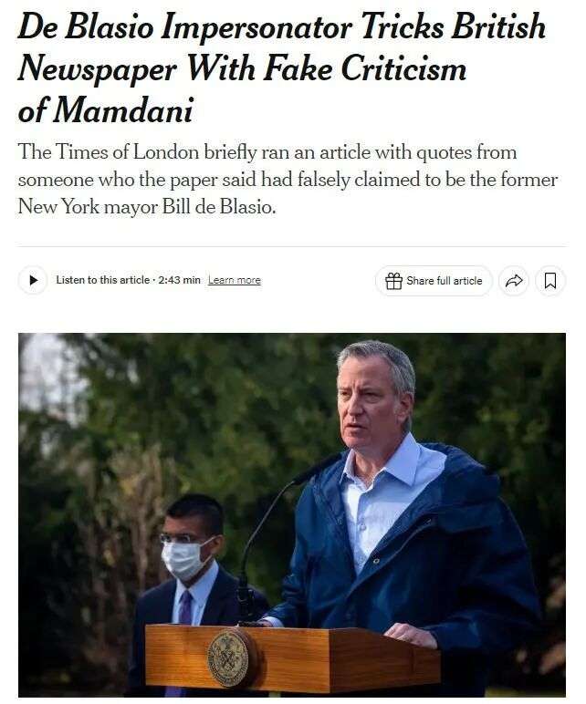 发言人说:“《泰晤士报》发现我们的记者被一名冒充纽约前市长的人误导,而后立即向比尔·德布拉西奥道歉并撤下了文章。”
