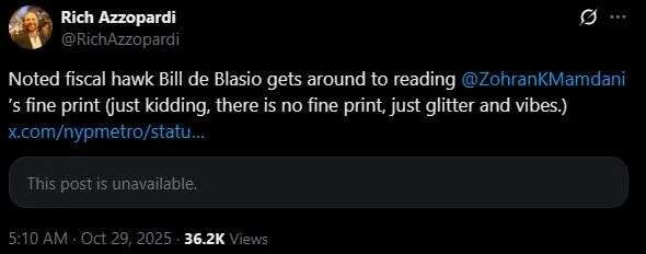根据民调,现在最热门的候选人叫佐兰·马姆达尼(Zohran Mamdani),他得到了2014~2021年的纽约市长比尔·德布拉西奥(Bill de Blasio)的支持,甚至应该说力挺——在公开场合,德布拉西奥对马姆达尼一直赞不绝口;马姆达尼也投桃报李,说德布拉西奥是他见过最好的纽约市长。