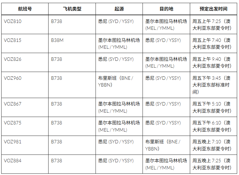 在公布的取消航班清单中,涉及8个关键班次:VOZ810、VOZ815、VOZ826、VOZ960、VOZ867、VOZ875、VOZ981以及VOZ884,这些被取消航班均采用波音738或B38M机型执飞。