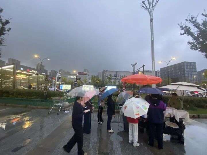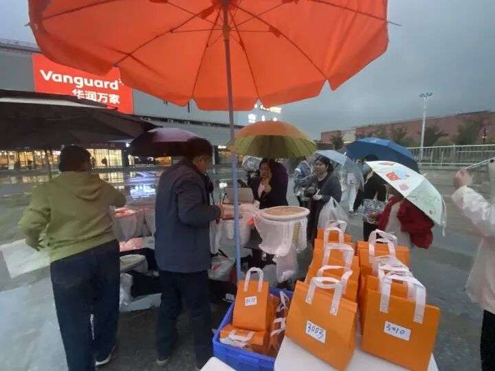 昨天下午5点不到,下起了小雨,赵唯宏和父母推着车来到广场前,原本在沿街商铺躲雨的人突然一哄而上,朝摊子围了过去,吴女士也想冲进雨里,赵唯宏一把拉住,“提前预订的不用这么急,他们是急着去排队现场买。”