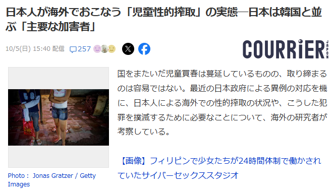 媒体甚至直接点名日本和韩国是海外买春的主要加害者:日本男性与韩国男性在海外——尤其是东南亚、太平洋诸岛,甚至蒙古——成了儿童买春的主要顾客。