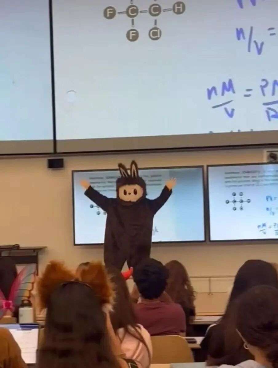 去年爆火的UC Davis化学教授,今年依旧“整活”:穿着一身毛茸茸的Labubu套装蹦进教室,学生一阵爆笑。