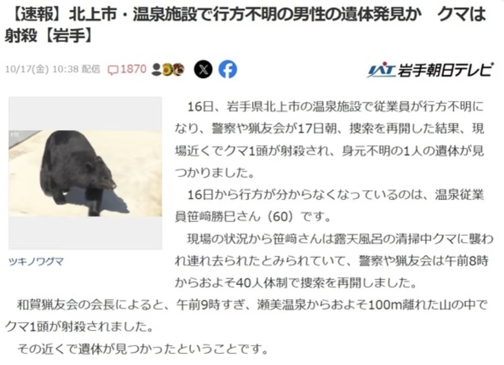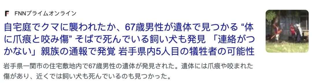 在岩手县一关市,一名67岁老人在自家院子被熊袭击致死,饲养的狗也一同遇难。