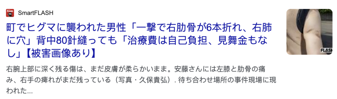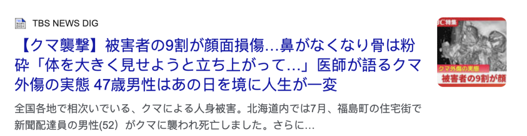 2021年,札幌市东区发生的熊袭击事件主角就是棕熊,一名40多岁的公司职员被1.6米高的棕熊袭击,一击就打断了他右侧六根肋骨,刺穿了右肺,导致气胸。全身缝了100多针,后遗症包括PTSD和运动限制。