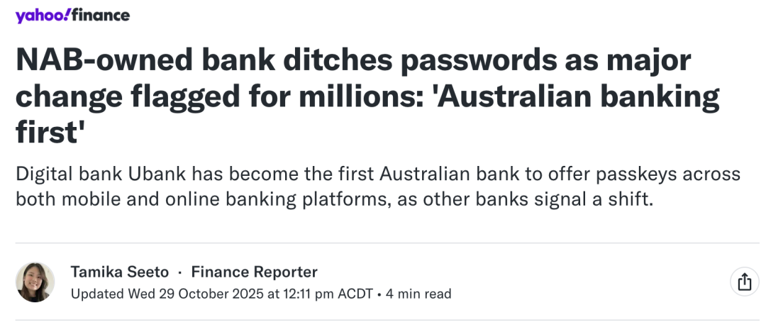 随着越来越多的机构,包括政府部门与支付平台采用Passkey技术,澳洲正迈入一个无密码社会的新时代。