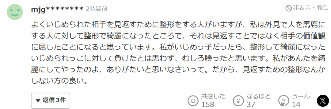 有喜欢的,就会有看不惯アレン的。有日本网友表示,被霸凌后再去整容这件事完全就是屈服于霸凌者的价值观下。