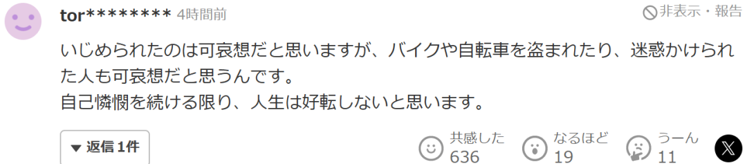 “我觉得被欺负确实是很可怜的,但那些摩托车或自行车被偷、被他带来麻烦的人也同样很可怜。