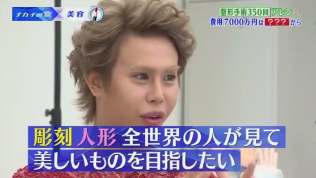 又过了一年,アレン再次登上了综艺节目。这次他透露已在整容上花费3500万日元,脸上动刀已经超过200次↓