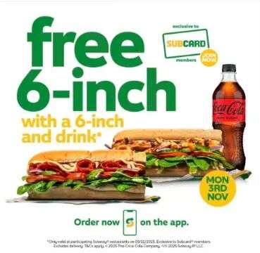 Subway送出福利:购买任意一个6英寸汉堡和饮料,免费赠送一个6英寸汉堡!