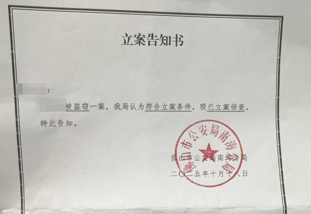 黄女士认为,手镯在运输途中遭到了偷窃,于是向警方报案。佛山市公安局南海分局平洲派出所的报警回执显示,9月18日上午10时56分,黄女士向公安机关报警。佛山市公安局南海分局的立案告知书显示,黄女士被盗窃一案,警方认为符合立案条件,已立案侦查,落款日期为10月18日。