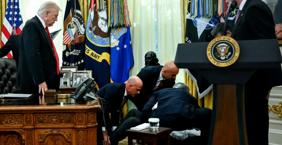 然而,就在政策宣布尚未结束时,意外发生。川普当场面露惊讶,随后示意工作人员暂停会议,场面安静数秒,医疗人员随即冲上前协助,气氛一度极为紧张。