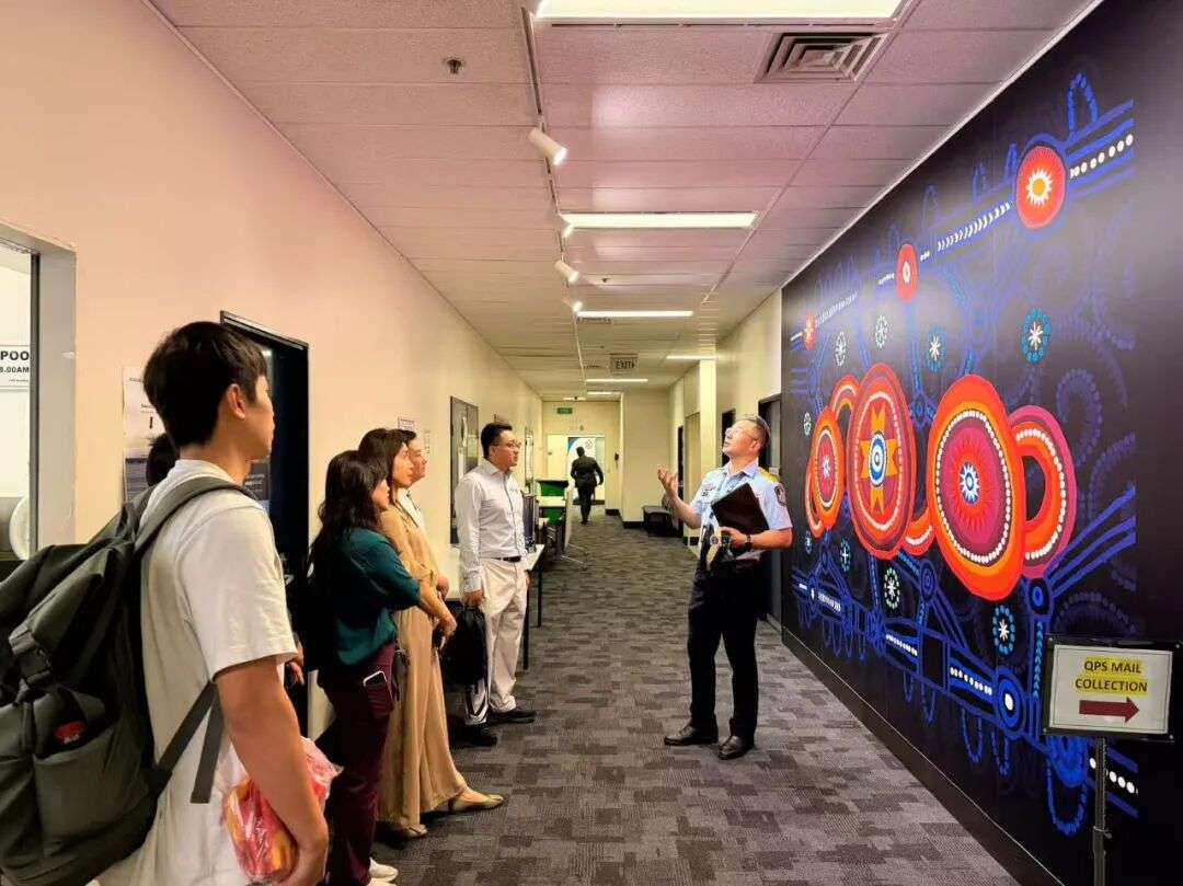 昆士兰警务处华人高级警民关系联络主任向青年成员简要介绍了昆士兰警务处 (QPS) 161年的历史沿革,并讲解了总部大厅内《仰望星空》(Look to the Stars)艺术作品的象征意义——它体现了警队与原住民社区之间的合作与尊重。