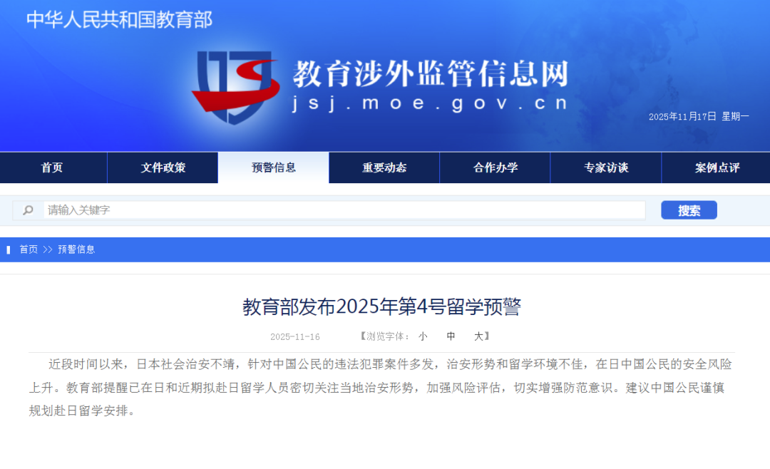 与此同时,教育部门也已发布最新留学预警,强调日本当前治安与留学环境不佳,提醒正在日本和计划赴日的学生务必加强风险评估,提升安全意识,谨慎制定相关安排。