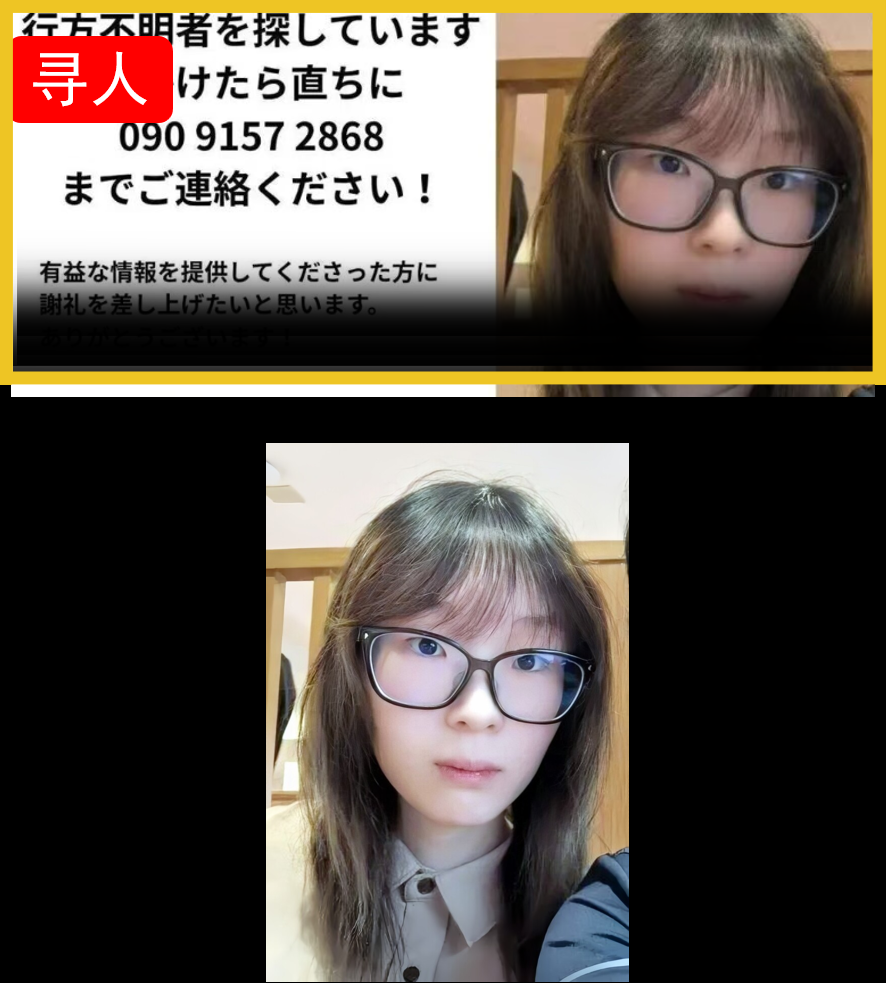 她20岁,165厘米,黑色长发,失踪当天穿着黑色上衣。