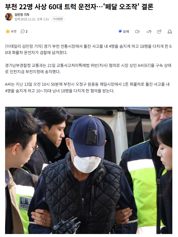 京畿南部警察厅交通科21日以违反《交通事故处理特例法》(致死)嫌疑,将市场商户A某(67岁)在拘留状态下移送至仁川地方检察厅富川支厅。