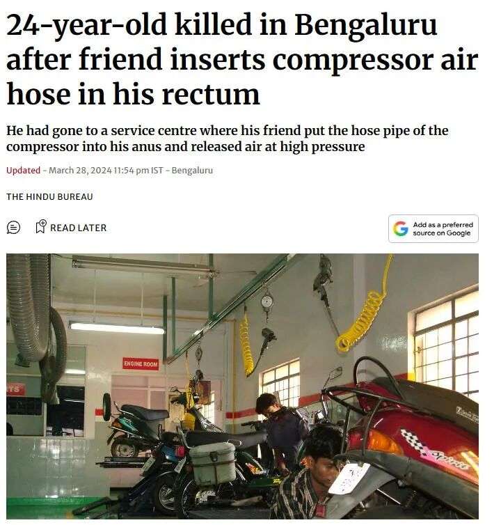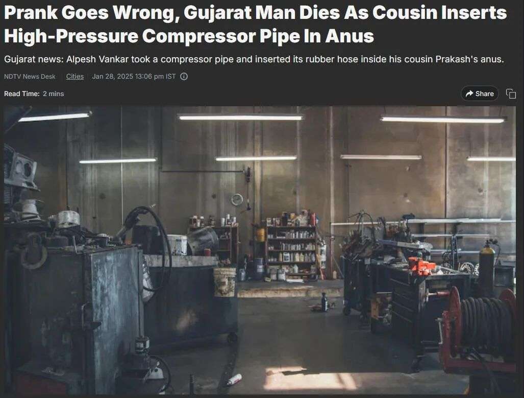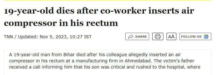 2023年11月,又又又是在印度,一制造厂内某19岁男子和同事打闹,期间被空气压缩机插入直肠......