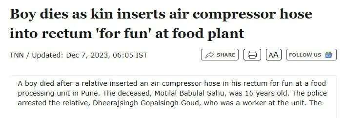 2023年12月,印度某食品加工厂内,一16岁员工和一21岁员工趁闲时开玩笑,后者将压缩空气插入前者的直肠.....