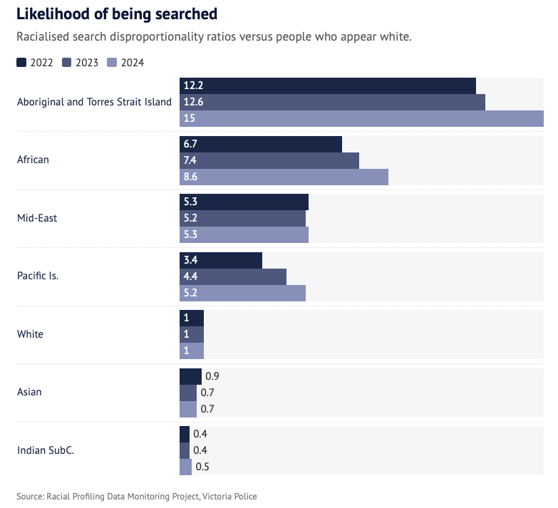 2024年期间,被维州警方认定为原住民的人,遭到搜查的可能性是白人的15倍,