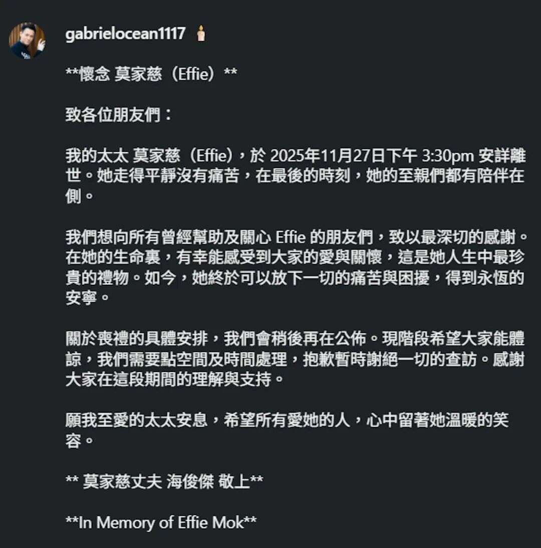 11月29日,TVB演员海俊杰在社交平台发文悼念妻子,透露太太莫家慈于 2025年11月27日下午3点30分安详离世,“她走得平静没有痛苦,在最后的时刻,她的至亲们都有陪伴在侧。” 有关丧礼的具体安排,海俊杰表示会稍后再作公布。