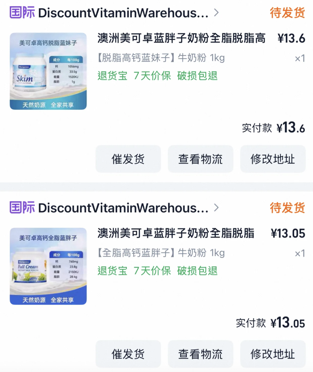 在这篇帖子下面,大批网友开始晒单,仔细一看他们购买这些奶粉的价格低得惊人。比如说有网友晒出了自己购买1kg澳洲奶粉的价格,一桶只要13.6元...