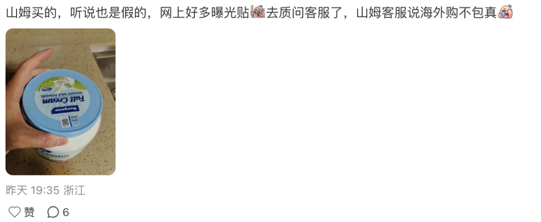 也有网友表示,自己在山姆购买的奶粉,看到黑心工坊遭曝光的新闻后去问了客服,结果客服表示,海外购不保真...