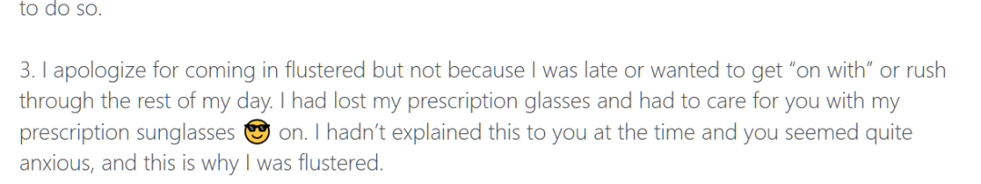还有更夸张的是,在被一位患者投诉他不专业而且整个就医过程很混乱后,他回应:“我为自己当时看起来有些慌乱道歉,但那并不是因为我迟到,或是急着赶行程、想快点结束,而是我把自己的度数眼镜弄丢了,只能戴着有度数的太阳镜 给你看诊。”