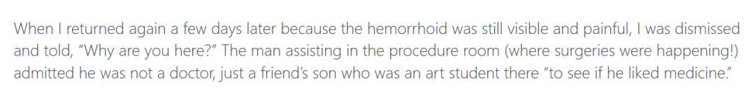 有位患者说自己也是莫名其妙被推着做了手术,“更离谱的是,手术室里帮忙的那位年轻男子,手术真的就在那个房间里做的。他竟然告诉我,他不是医生,只是某个朋友的儿子,是个艺术专业学生,来看看自己喜不喜欢医学。”