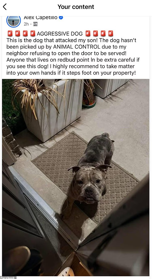 “请我附近的邻居务必小心这条狗。”亚历克斯在 Facebook 写道,“求你们帮帮我!我儿子的伤必须有人负责。”