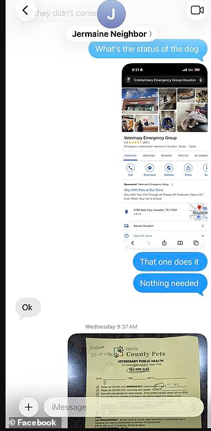 哈里斯县公共卫生部门称,次日一名动物管制官员被派往社区调查,并试图联系狗的主人,同一条街的邻居杰梅因·阿姆斯特朗(Jermaine Armstrong)。官员在他家门口留下了多份关于狂犬病隔离的通知。