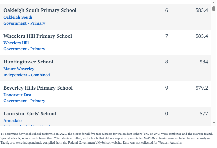 该区域其他表现突出的公立学校还包括Wheelers Hill Primary、Beverley Hills Primary和Serpell Primary,它们的成绩均超越多所精英私立学校——例如年费超过2.9万澳元的Fintona Girls’ School和Trinity Grammar。