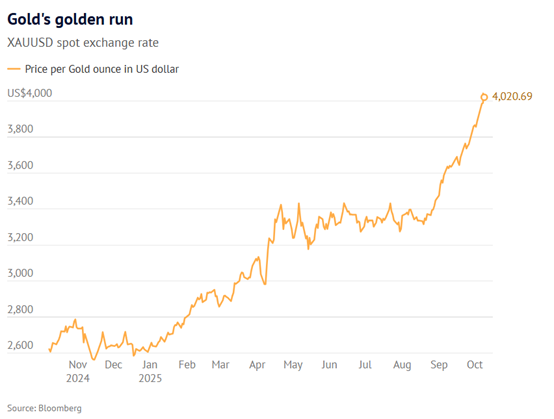 结果到十月,黄金期货价格一路上涨,全年飙升60%,突破每盎司4000美元(约6071澳元)大关,表现优于美国股市和惨淡的比特币。