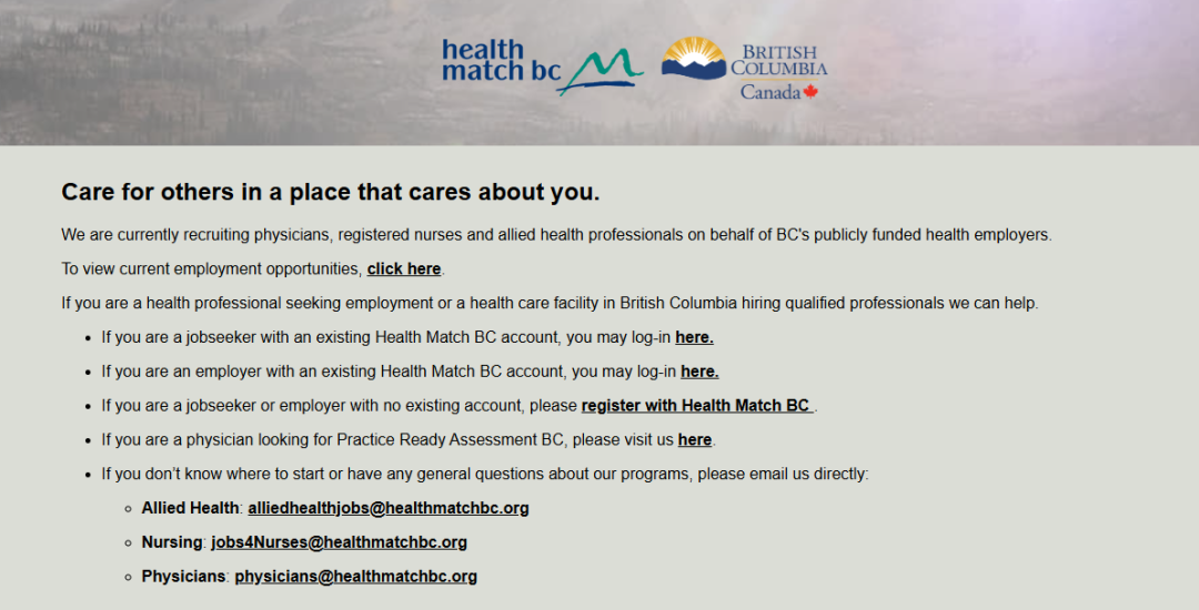 为了增加竞争力,省卫生厅也设立了一个网站,协助医疗专业人员去处理行政程序、文书工作,以及在 BC 执业所需的学院认证等步骤。