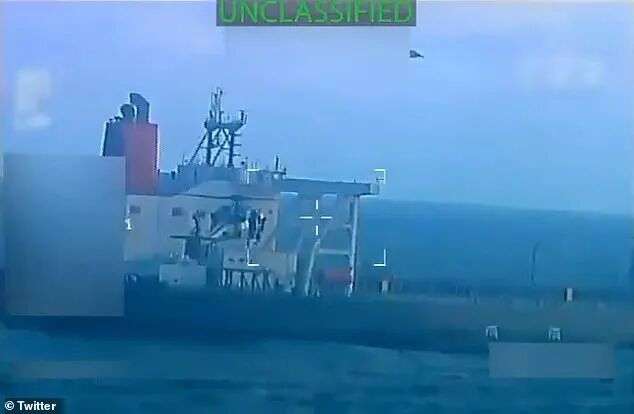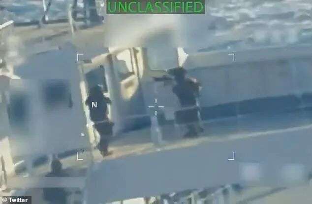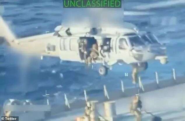 视频中,美国突击队员从直升机上沿着绳索快速滑降,全副武装冲上一艘油轮的甲板,枪口对准船只各个角落。