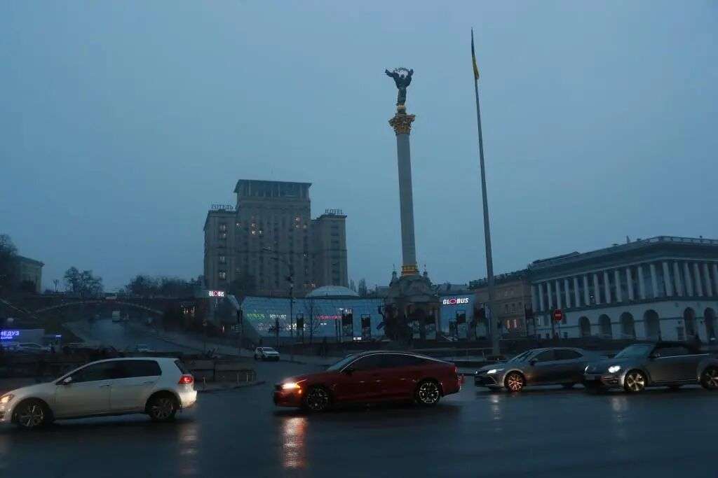 2025年11月20日,因俄乌冲突,乌克兰首都基辅主要街道的照明设施出现大面积停电,车辆在暮色中驶过独立广场。图源:新华社