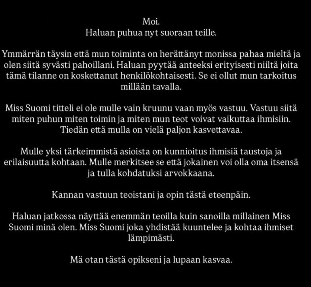 环球小姐的芬兰分部官方在一周内持续回应此事,发布了多篇道歉声明,重申了选美比赛的价值观,称绝不接受任何形式的种族主义或歧视行为。