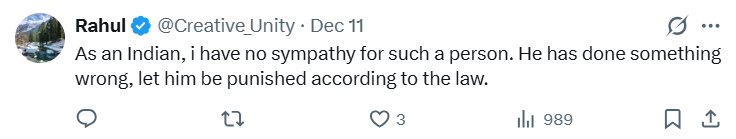 “作为一名印度人,我对这样的人毫无同情。他做了错事,就应该依法受到惩罚。”