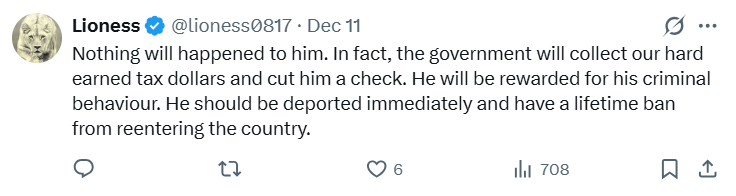 “不会有任何事情发生在他身上。事实上,政府会用我们辛苦挣来的税款给他开支票。他会因为自己的犯罪行为而被奖励。他应该立刻被遣返,并终身禁止重新进入这个国家。”