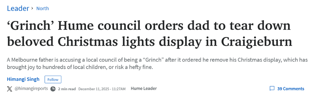 但令人心寒的是,12月2日,他所在的Hume Council突然发来通知,要求他在12月23日前将装饰拆除,否则将被罚款9000澳元,理由是他“未获得书面许可”。