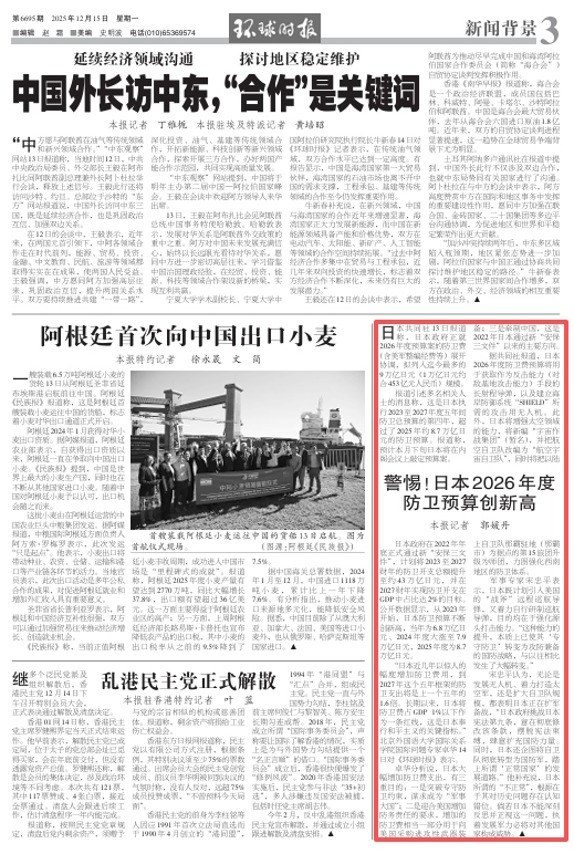 日本共同社13日报道称,日本政府正就2026年度预算案的防卫费(含美军整编经费等)展开协调,拟列入迄今最多的9万亿日元(1万亿日元约合453亿元人民币)规模。